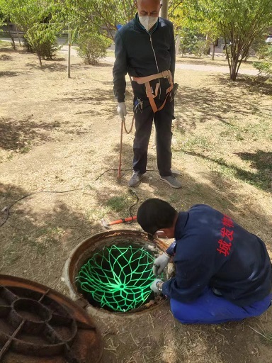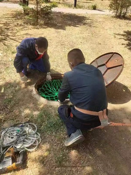 安装现场,工作人员打开井盖通风,在用气体检测仪检测井内的气体符合作业条件后,工作人员绑好安全带用电钻在井壁上钻孔,钉入尾端带钩的膨胀螺栓,拧紧固定后将防坠网挂到挂钩上,一张防坠网就安装完成。现场工程师傅每完成一个防坠网的安装,在确保安全的情况下,都会亲身踩试检验,确保安装牢固。