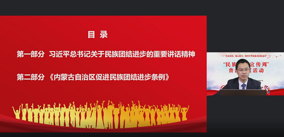 本次培训以良法善治,凝心聚力,铸牢中华民族共同体意识为主题,中国政法大学刘东刚博士围绕习近平总书记关于民族团结进步的重要讲话指示精神、《中国共产党统一战线工作条例》《内蒙古自治区促进民族团结进步条例》《中华人民共和国国家通用语言文字法》《内蒙古自治区实施〈中华人民共和国国家通用语言文字法〉办法》《民族区域自治法》《城市民族工作条例》的重点亮点内容进行了解读。